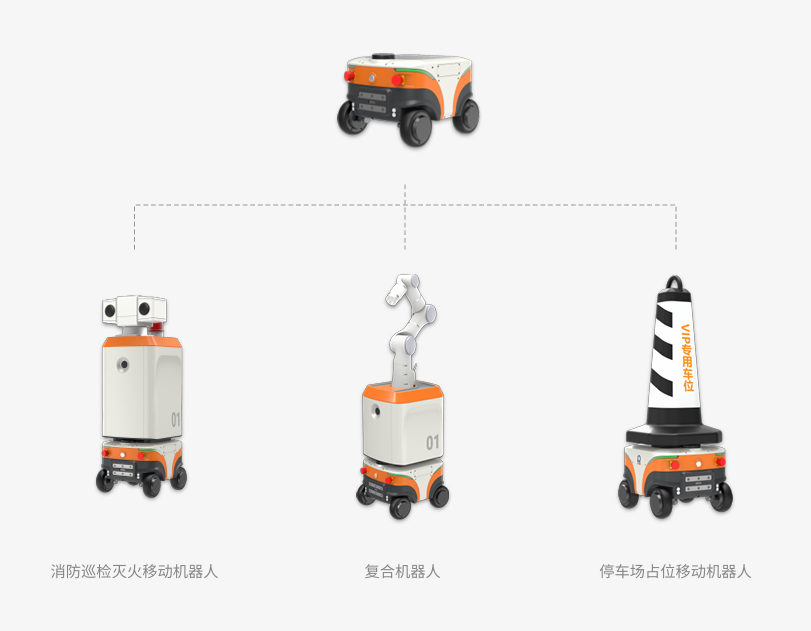 该移动底盘具有完美性能和便利接口可以搭载扩展机构组成场景专用机器人,以对应客户各种不同需求。如消防巡检及灭火机器人、复合机器人、停车场占位移动机器人。