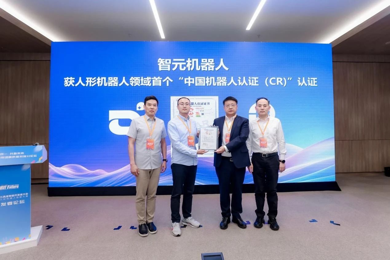 2025张江具身智能开发者大会上,国家机器人检测与评定中心(总部)为上海智元新创技术有限公司颁发了全球首张人形机器人CR认证“001”证书。